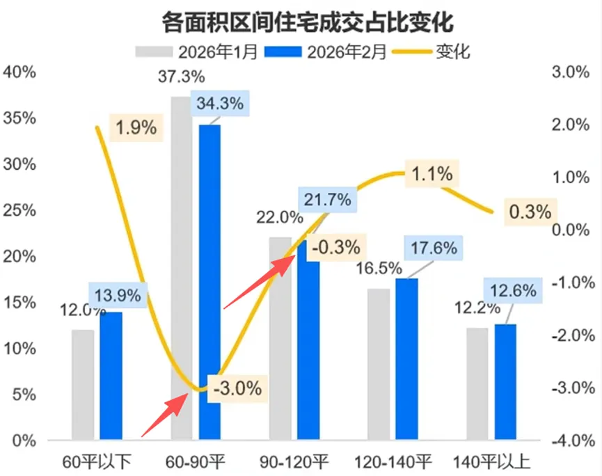 其中60㎡以下占13.9%,环比提升最大1.9%,老破小继续占主导。