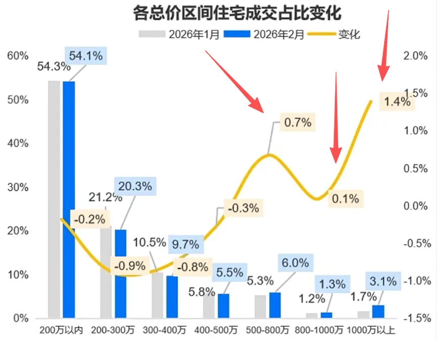 总结,2月仍旧是低总价房源主导,但“量缩价升”的特征主要是高总价房源成交占比在低基数下的结构性提升。