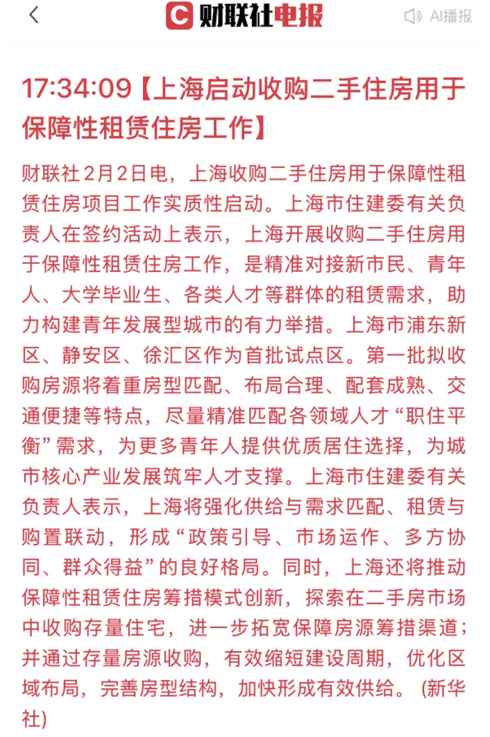 官方收储二手房,上海、广州等36城启动,国企收购存量房用作保障房。