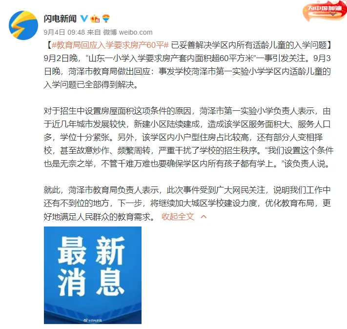 点蓝色字关注“中央广电总台中国之声”新学期伊始,山东菏泽某小学要求“房产套内面积超过60平米才能入学”的消息引发关注和讨论。有网友表示此举“嫌贫爱富”,违背“教育公平”原则。学校负责人则表示,设置房产面积的条件是应对炒作学区房行为,实属“无奈之举”。目前事件有何最新进展?小学入学要求房产套内面积大于60平