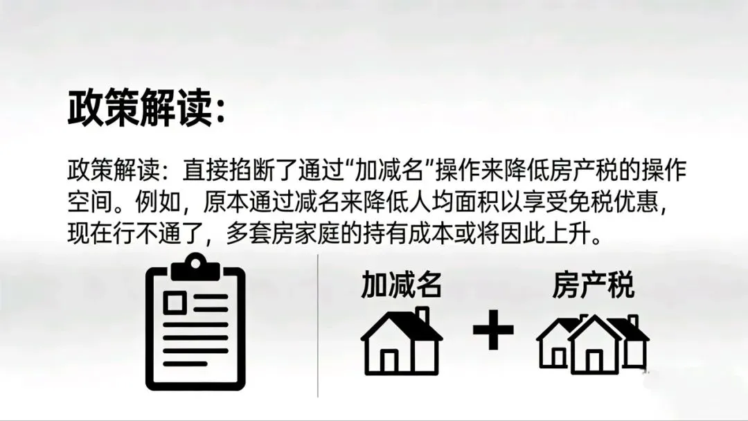 影响:多套房家庭持有成本上升,无法再通过 “加减名” 降税。
