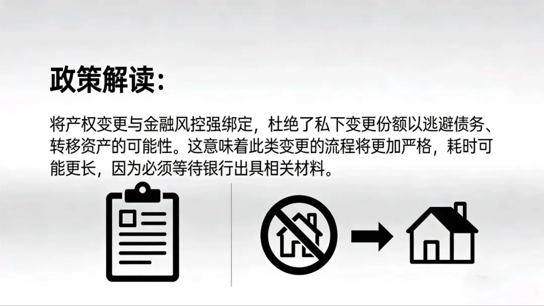新规要求:必须先取得银行同意,让银行同步提供抵押变更材料,一起提交到不动产登记中心,才能办理份额变更手续。以前不用找银行,现在少了银行的材料,根本办不了,避免出现产权和抵押脱节的风险。