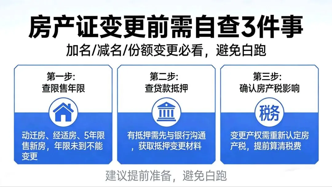 敲黑板!不管是夫妻间加名、减名,还是给父母、子女增减名,只要房产证上的权利人有变化,之前的房产税认定就不算数了,必须重新去税务窗口办理认定手续 ⚠️