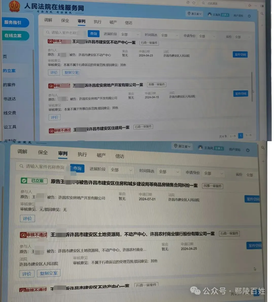 2024年4月立案,2024年9月29日许昌市建安区法院作出(2024)豫1003民初5185号民事判决书,驳回了原告的诉讼请求。原告认为上述一审法院判决认定事实不清,适用法律错误,证据审核不力,漏审,依法上诉;2025年1月20日,许昌市中院作出(2024)豫10民终2566号民事判决书,驳回上诉,维持原判。这于情于理于法让原告感到难以理解和接受。恳请上级领导在百忙之中予以关注,依法查明事实,抽丝剥茧,拨乱反正,维护国家法律权威和百姓正当权益。