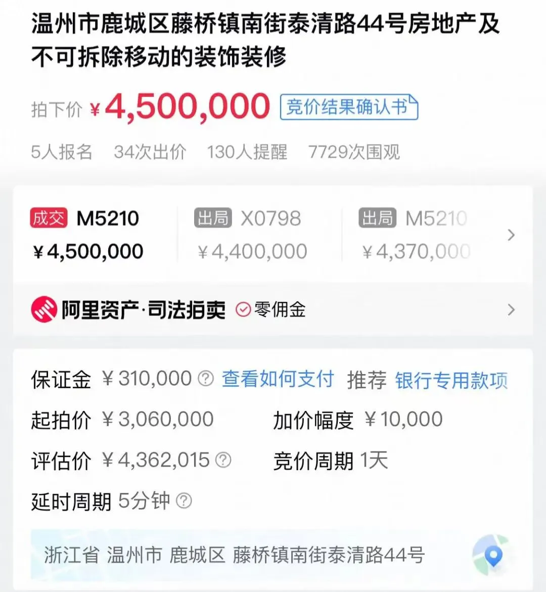 近日,藤桥镇南街泰清路一处房产在司法拍卖中引起关注。该房产最终以450万元的高价成交,相较于起拍价暴涨了近150万元,成为了市场热议的焦点。该房产引来了5人报名,总共34次出价,以450万成交。
