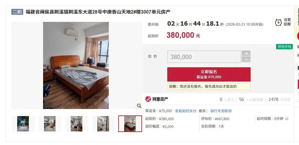 福建省闽侯县荆溪镇荆溪东大道28号,中庚香山天地2#楼3007单元房产,房屋产权面积88平米,3房2厅,高楼层,居家装修,起拍价格380000元,每次加价幅度3000元,被闽侯县人民法院起诉拍卖。