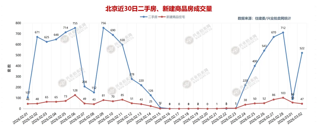 2026年3月2日北京二手房成交522套,本月累计成交612套,其中住宅成交479套,本月住宅累计成交567套,北京新建商品住宅成交47套,本月累计成交105套。