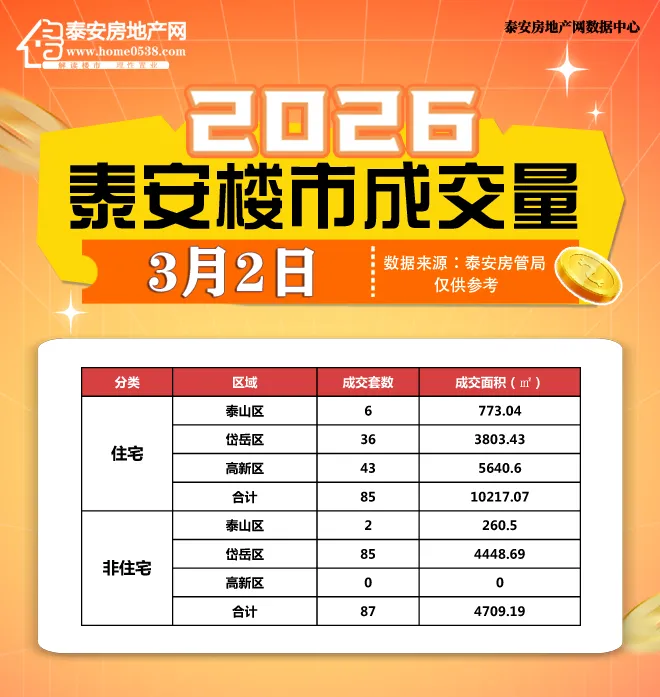 【泰安房地产网讯】据本站不完全统计,2026年3月2日泰安市共成交商品房172套,其中住宅网签85套,总面积10217.07㎡,办公、商业网签87套,总面积4709.19㎡,与3月1日相比环比上涨1463.64%。
