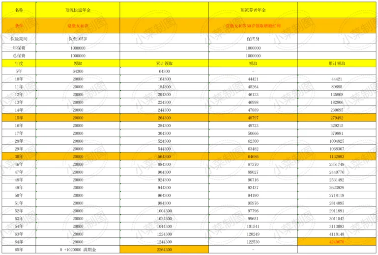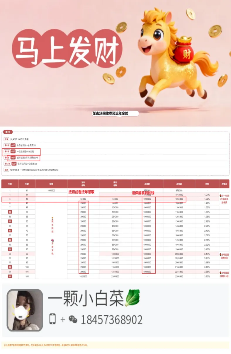 无论你买二手房用来坐等升值套现或者是用来出租换取每月的房租钱,你都需要对房屋进行基本的维修、保养、改善等费用,我做装修的舅舅告诉我说,110平米旧房改造大约需要10-20万元左右。打理一套房子,既要面临贬值、流通性困难,还要有一大堆麻烦事,找租客,保养房屋,这个性价比对于很多普通人来说实在是不太划算。你有没有想过,用这100万换取一份金融房产?它不需要你劳心劳力地定期维护,一旦购入终身受用,按月或者按年准时给你打钱,不考虑通货膨胀等因素,100万永远就是在那里的100万,而且变现极其简单,假如你碰到紧急情况要钱的时候它就能换成银行卡上的数字。这个产品就叫做快返年金,是手头大笔闲钱或者银行大额存单替代品的好去处。它不像养老年金那样一定要到法定退休年龄那样才可以领取,最快可以领取的产品一般是在第五年,从此,进入保本取息的幸福生活。假如我有大笔钱,我一定要入手这个产品(醒醒,起来打工了)。好,讲了这么多,让小菜用市场上的一款2%固定利率的顶流产品,做个演示(股东放在封面图了,哈哈)。假设40岁女性,100万保费一次性交,在第五个保单年度,也就是她45岁的时候,她就会拿到第一笔钱64300元,后面的每一年都有20000元的利息可以拿,也就是本金的2%,而从她开始拿钱的那一刻起,现金价值就会来到100万元,已经回本了,碰到紧急情况她随时可以领回自己的本钱。假如不幸身故,100万还将以指定受益人的方式给到她想要给的人;假如一直领利息,可以领终身,直到105岁,保险公司将会把本息合102万元给到她,保险合同终止。03.快返年金的利率变化和适用人群