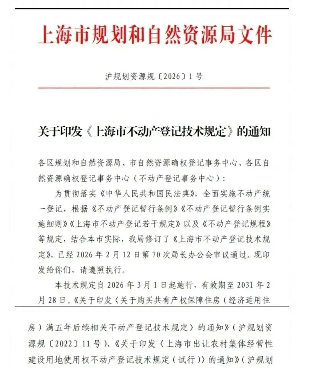 2026年3月1日,上海市规划和自然资源局修订印发的《上海市不动产登记技术规定》正式施行。