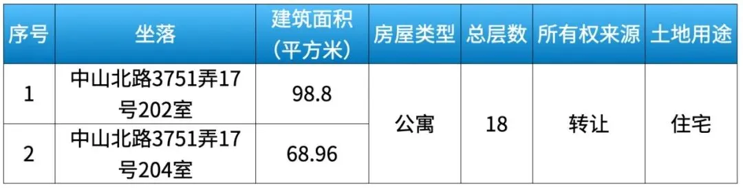 拍卖标的均位于中山北路3751弄17号2楼(海鑫公寓),分别为: