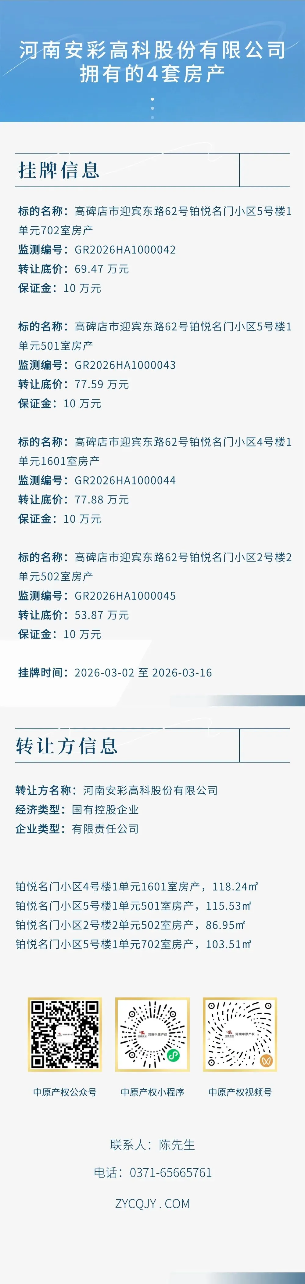 【房产出售】河南安彩高科股份有限公司拥有的4套房产