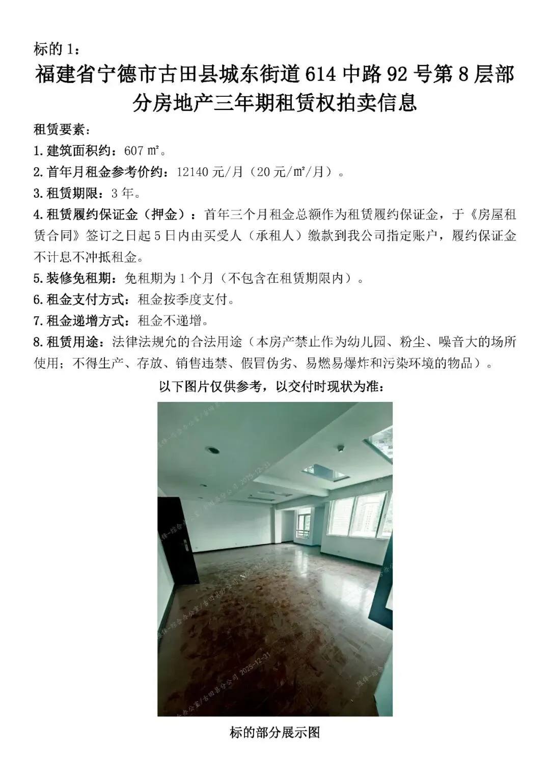 1.福建省宁德市古田县城东街道614中路92号第8层部分房地产三年期租赁权(出租建筑面积约607㎡)。