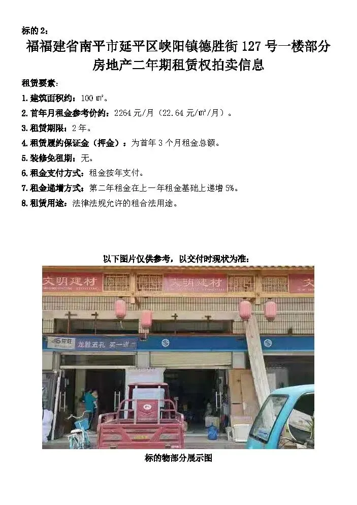 2.福建省南平市延平区峡阳镇德胜街127号一楼部分房地产二年期租赁权(出租建筑面积约100㎡)。
