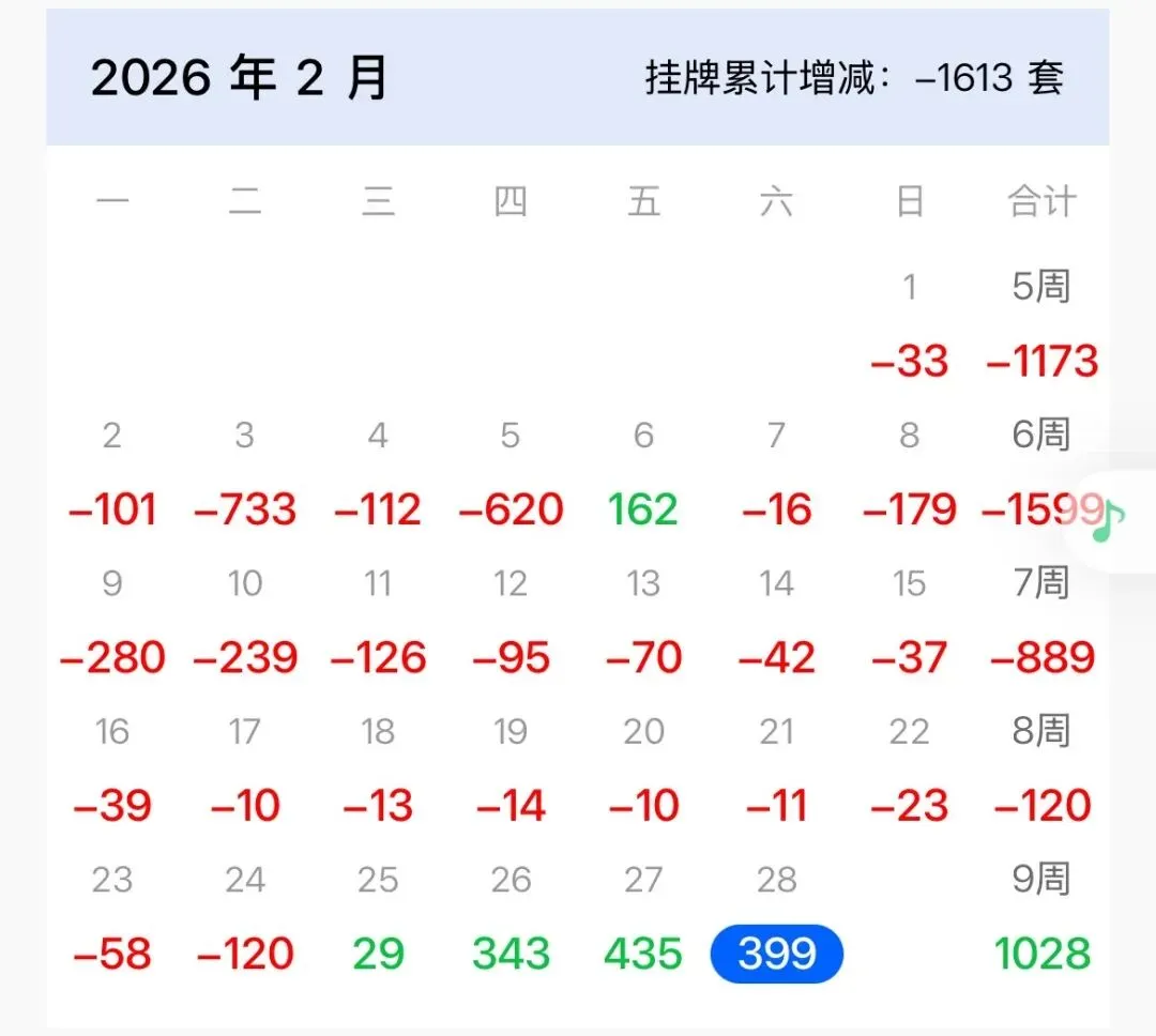 挂牌量方面,2026年2月二手房挂牌累计减少1613套,挂牌量进一步降低。不过在2月的最后一周,我们迎来了挂牌量的回升。