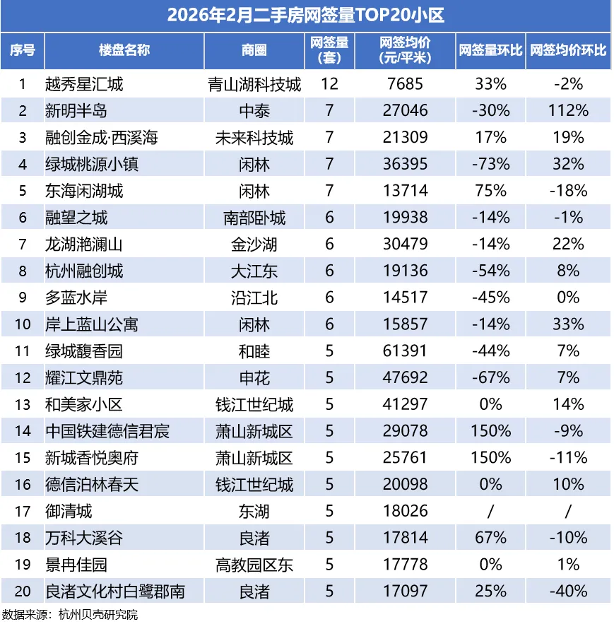 除了馥香园,西湖高尔夫、白云深处也分别成交了3套,总价都在千万以上。上城区多个高端改善次新房2月表现突出,南星桥的上品成交了2套,钱二天澜海岸、潮映万象轩分别成交2套,御道江河汇也成交了2套。本月新入榜的改善小区还有金沙湖的龙湖·滟澜山、世纪城的和美家,分别成交7套和5套。