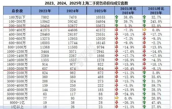 目前二手房市场成交体量庞大,2024年至今上海二手房以价换量,在多轮政策影响下,二手房价跌幅收窄、成交量进一步放大。2025年全年上海二手房成交23.3万套,同比上涨3.9%,创近四年新高。二手房成交结构方面也出现了新特征,呈现刚需增加、中间段萎缩、高端稳定的哑铃型结构。