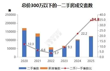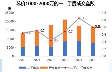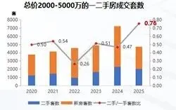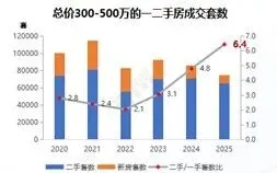 一、300-500万价格段全年成交套数为6.5万套,总量缩减,占比总成交套数的27%。从成交环线来看,外环外仍是主要成交区域,占比约5成,相比300万以下极致刚需略有下降。新政后外环内购房资格放宽,公积金贷款额度提升,叠加近三年来300-500万二手、一手套数比呈现持续上升的趋势,2025年套数比升至6.4,该价格段二手房交易同样利好明显。