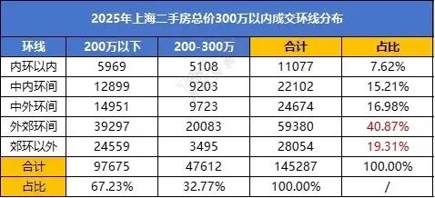 从成交环线分布来看,300万以内二手房2025年外环外成交套数占比达6成,外环内占比4成,本次新政主要放宽外环内购房门槛,外环内非沪籍居民购房门槛降低由原来的满3年及以上调整为满1年及以上,而外环外限购此前已经调整为1年以上,新政前后没有变化。也就是说新政后增量主要来自于外环内的四成客户,主要来源以买代租、博拆迁及追求性价比的客群,叠加新政公积金贷款额度从160万提高至240万,以300万为例,公积金贷款额度贷满240万,30年计算,月供9608元,对公积金额度高的极致刚需300万入住上海外环内还有具有较大的吸引力。