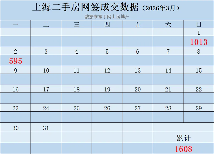 ▶ 上海3月二手房成交(统计截至3/2):3/2签约成交595套,3月二手房累计签约成交1608套(数据源自网上房地产);