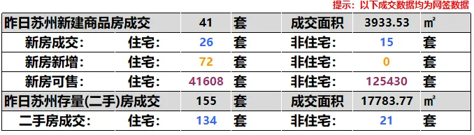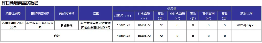 苏州3月2日住宅成交160套,新房住宅成交26套,二手房住宅成交134套,新房住宅新增72套,新房住宅可售41608套。
