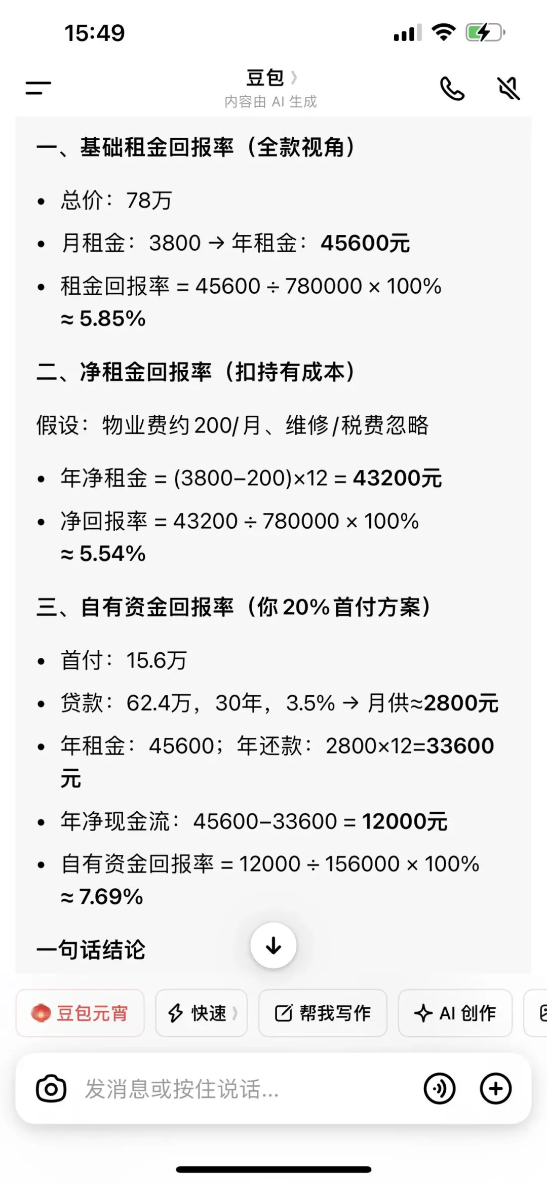 这是豆包给的方式,简单易懂。以后再买房收租可以参考这个计算方法。
