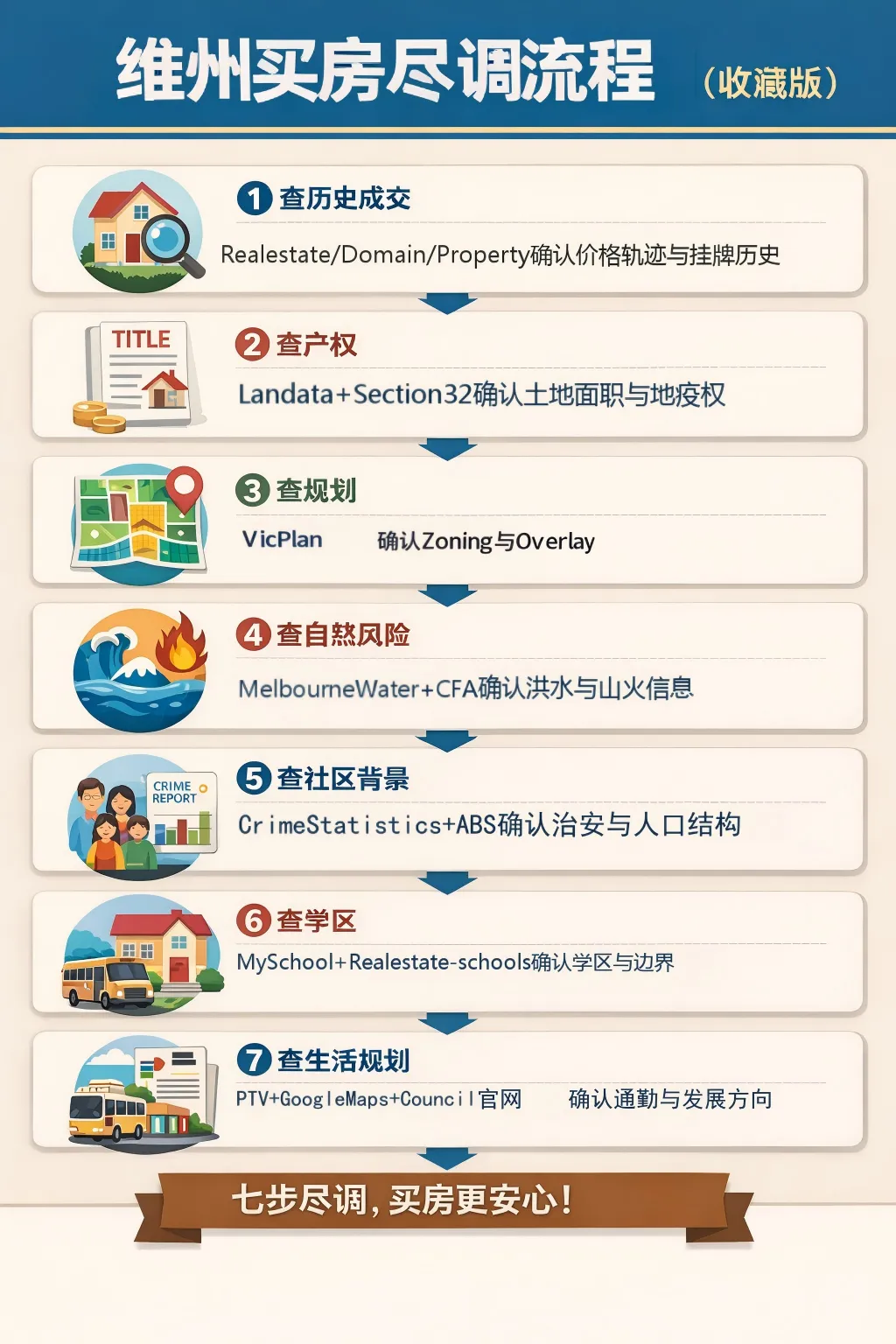 如果在VicPlan上看到洪水或山火标注,我会进一步去Melbourne Water或CFA查细节。