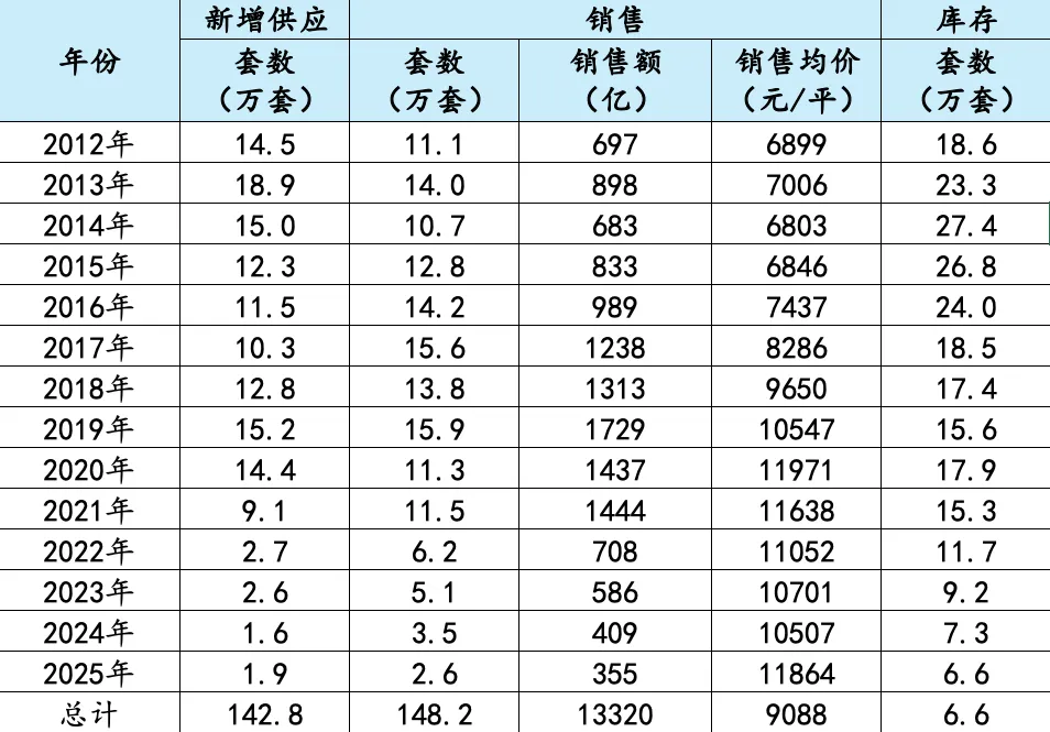 从2012年到2025年底,沈阳市的住宅市场到底供应了多少套,销售了多少套,均价是多少呢?可以看下表的数据。