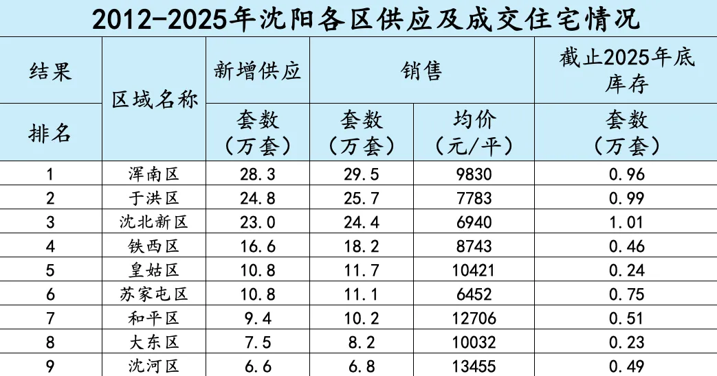 下面这张表格清晰展示了2012-2025年这十四年间,沈阳各区住宅市场的“成绩单”和“家底”。我们可以用“一场长跑比赛”来理解它。