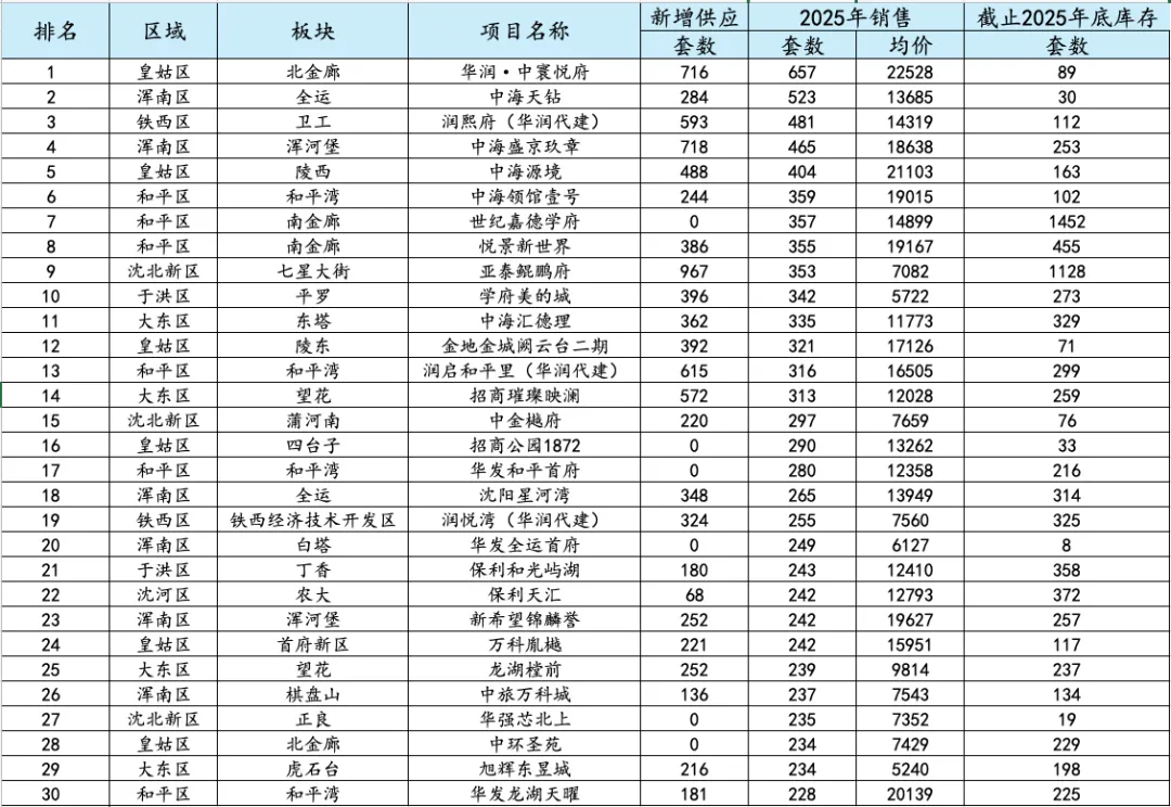 说完前面十几年的市场情况,这里我们聚焦一下2025年的沈阳新房住宅市场销售格局。这里我们可以直接根据去年在售的新房楼盘销售套数排名前30位的信息来进行分析如下: