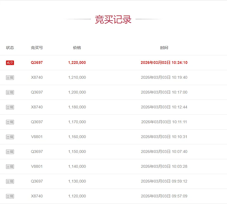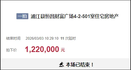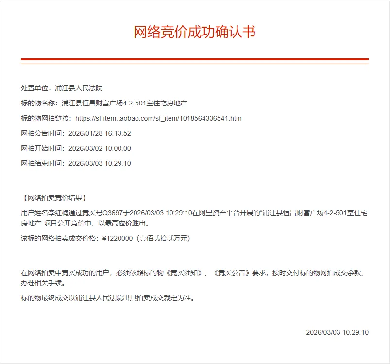 用户姓名李某梅通过竞买号Q3697于2026年3月3日在浦江县恒昌财富广场4-2-501室住宅房地产项目公开竞价中,以最高应价122万元胜出。