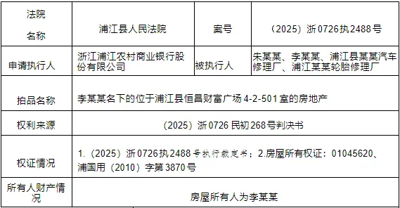 据悉:浦江县恒昌财富广场4-2-501室的住宅房地产。建筑面积为138.85平方米,土地使用权面积为20.64平方米。