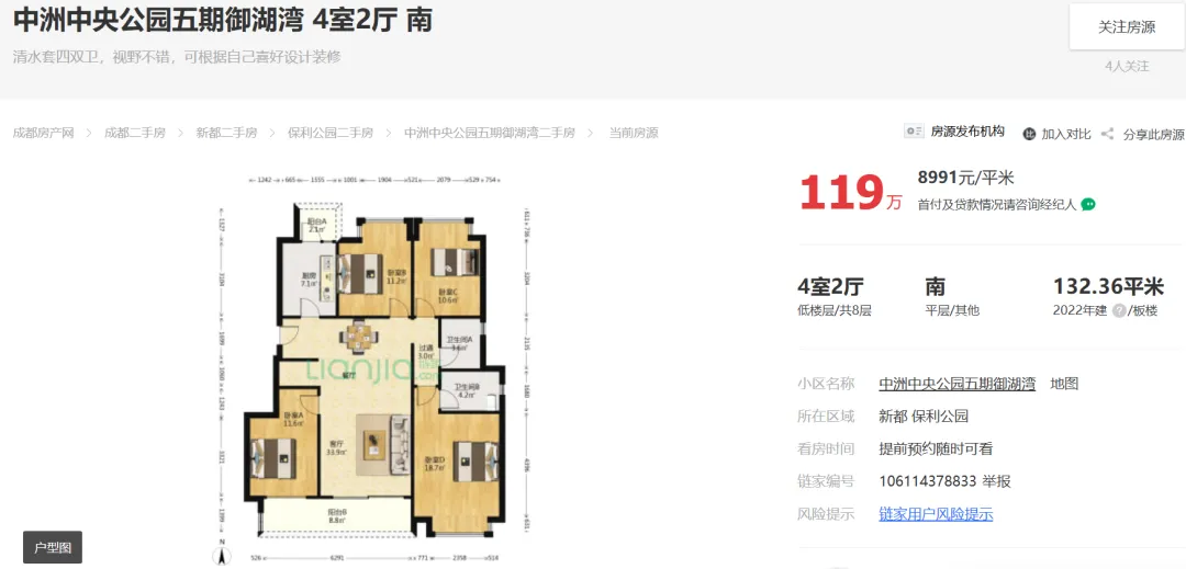 2026年03月03日,据市场端消息:成都新都198,中洲中央公园五期御湖湾建面132平套四报价119万;目前房东心里价在119万愿意出售。