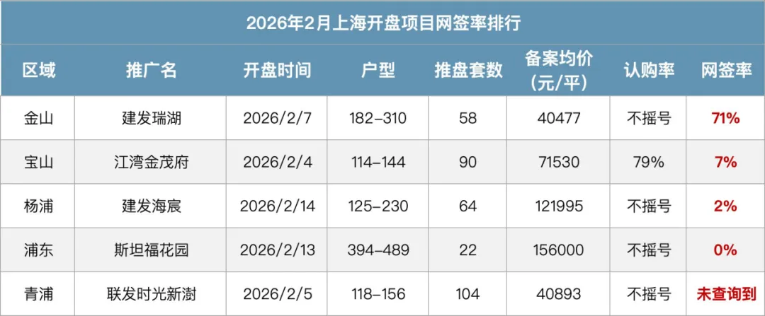 而宝山区的江湾金茂府网签率仅为7%,杨浦区的建发海宸网签率2%,浦东新区的斯坦福花园目前网签率为零。另有一个项目暂未查询到网签数据。