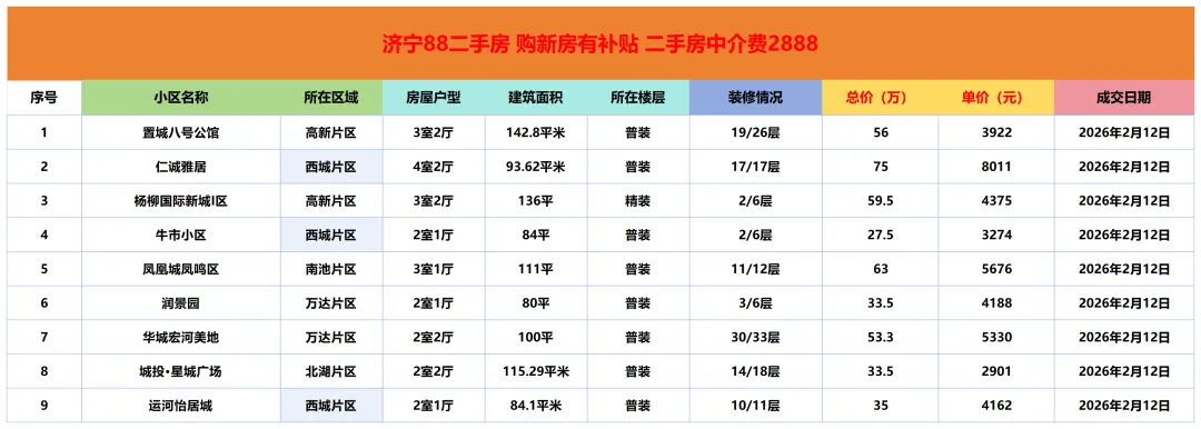 济宁二手房成交市场价参考|2月12日