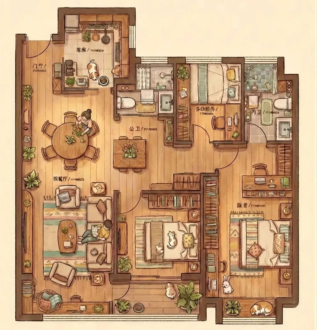 前些日子看到几张“中间套经典户型”的卡通版设计图,感觉很有意思,选3张分享给大家一瞧一瞧:
