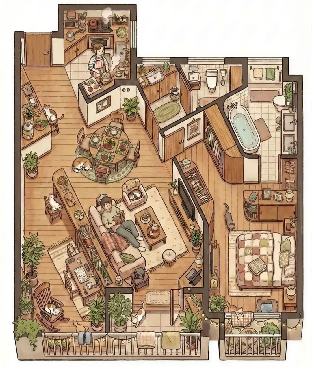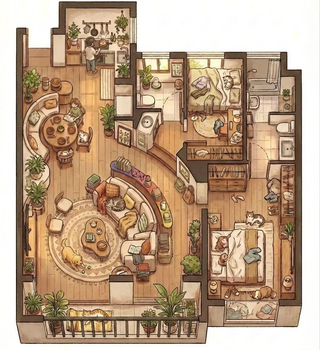看第一张的时候觉得:嗯,不错,卡通版,挺有意思的,视觉上很直观,对平面图不太懂的宝子们也能看明白。看第二张图的时候觉得:这个有点炫技了嗷!~那么多圆弧形的设计,不管是材料还是施工,都挺麻烦。但确实挺有创意挺好看。