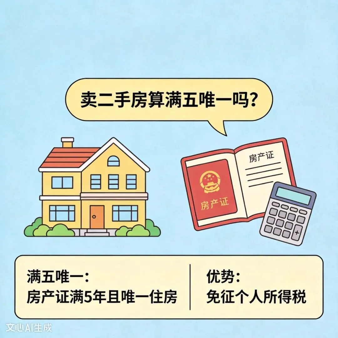 - 满五:看你这套二手房的房产证日期或契税票日期,满5年即可。