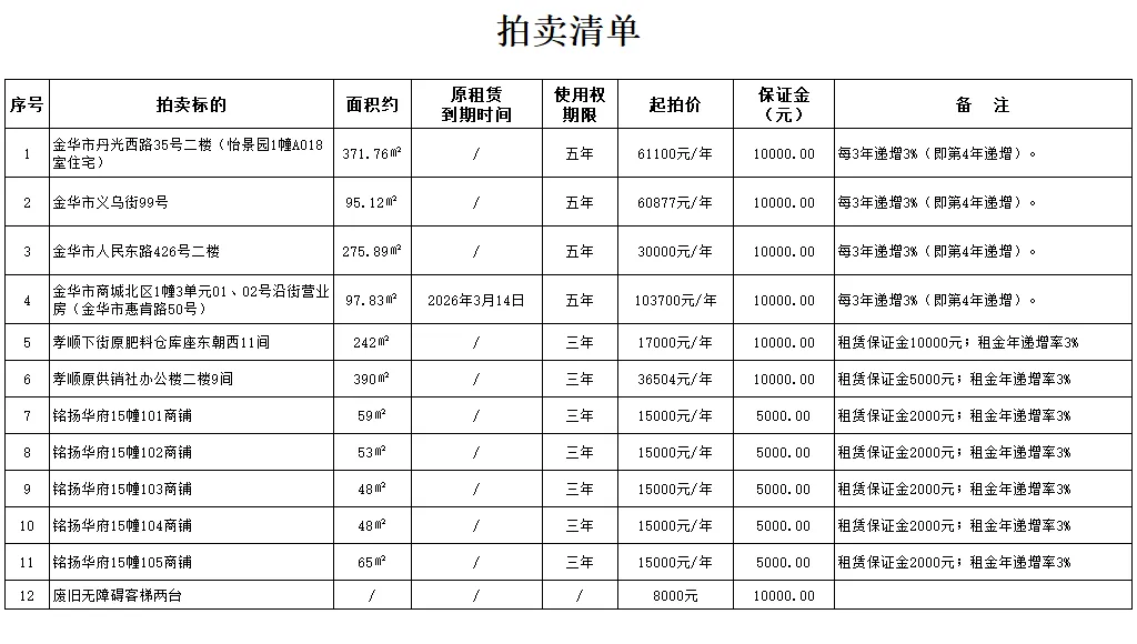 1、位于金华市丹光西路、义乌街、人民东路、商城北区、孝顺、铭扬华府等11处房产3年-5年使用权,面积约48平方米-390平方米,起拍价1.5万元/年-10.37万元/年,保证金0.5万-1万元。