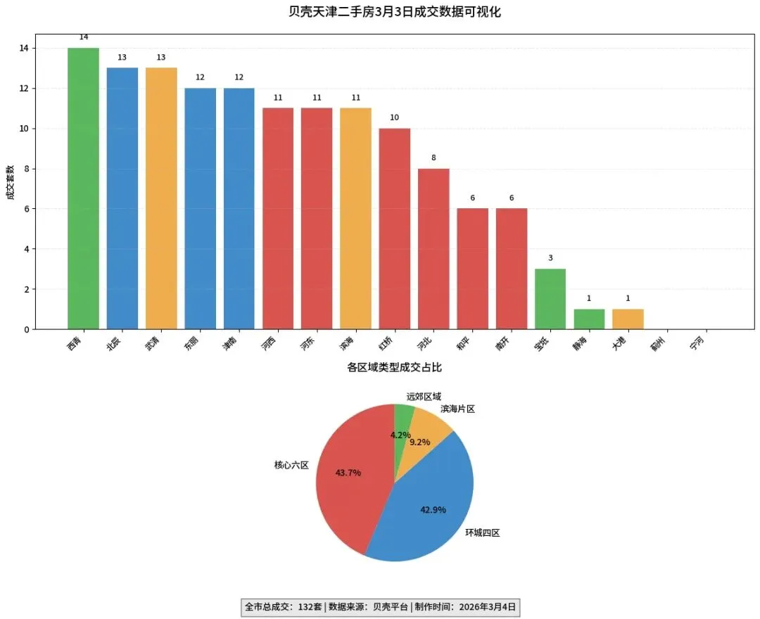 3月3日天津二手房市场整体平稳,总成交132套。市场呈现“核心六区与环城四区并重,远郊区域分化明显”的特点。刚需和刚改需求是绝对主力,同时市区改善需求也保持稳定。