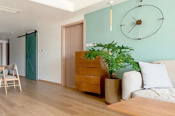 在客厅里继续探索着,瞬时,一处独特的角落,引起了我们的瞩目了。在客厅的一角里,设计师Joy放置了一盆郁郁葱葱的绿植,与一张精致尔雅的原木橱柜,而就在淡绿色的墙面上,是一个寄居蟹现代艺术感的时钟。这生机勃勃的绿植,与墙面色彩交相辉映,仿佛让人置身在清新的大自然之中,彰显了北欧风情的浓郁情调。而原木的橱柜,制作考究,用材优质,人们常说:“一个橱柜,就是一场体验。”在打开橱柜的那一刻里,主人就开启了一场独具一格的生活之旅了。与此同时,墙面上的时钟,随着时光的转变而移动着,让空间里宛若有了时间的维度。这个角落,可以说,它是客厅里一道别致的风景线,也将家的北欧情致转叙了,它俨然标记了家空间的风格,也成为家澹雅的注脚了。