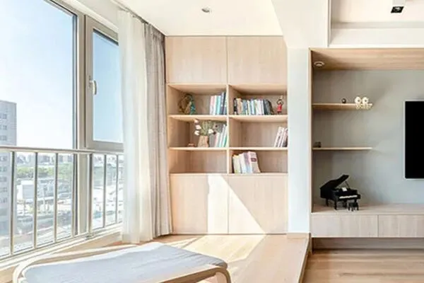 稍走了几步,来到了家的阳台空间。这个阳台空间面积不小,而设计师Joy在此也颇费了匠心。设计师Joy以原木为主要材料,在阳台上,铸就了一处收纳与陈列柜。这个柜子,顶天立地,邂逅天花与地板,中间以陈列为主,放着一些书籍,上下两个部分,以收纳杂物为主,实现了美学与功能的精巧平衡。在这个精巧的空间里,不但是一处精心利用空间之处,也是一家人在此享受温暖阳光之地了。这一个阳台空间,是家的独到场域,也转译了家的舒怡感,更留下了美好生活的痕迹,让人倍感雅致了。