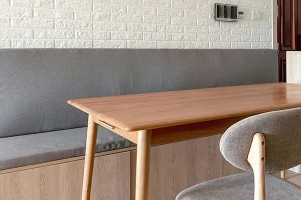 移步到了餐厅区域。餐厅的面积适中,在这里的设计上,设计师Joy依旧承袭了北欧风情,将北欧特色的原木与灰色系作为了主导。在一张温润的原木餐桌,与两张淑雅的餐椅,和一面卡座的设计之中,弥散这内敛朴实的韵味来。值得一提的是,这张餐桌,采用了经典的传统手工艺的打磨,在使用了高端木漆之后,纹理更加细腻,且表面经久耐用了。试想,一家四口人,在此乐享着饕餮可口的美食,一张餐桌就拉近了家人之间的距离,美食成为了他们的中心。在觥筹交错之间,餐厅里,释放出温馨的气韵。而这间方寸的餐厅里,也满载着一家人对于舒适生活的美好期许,素净的餐厅里,饱含着现代城市生活的百滋百味,让平凡的生活里注入了各种曼妙的滋味了。