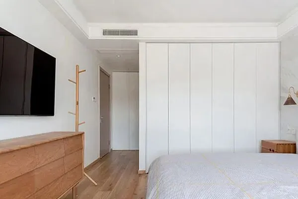 步履不停,在主卧室落脚了。若不是我们亲身经历,也不会对这个卧室空间发出如此的感叹之情了。设计师Joy将北欧风一以贯之,在这间面积富裕的卧室里,白色与原木色是空间的主色调。简洁的大床,利落的橱柜,尔雅的电视机柜,一起配合出了这一处柔韵的休憩空间了。在这风华无限的卧室里,步入其中,就好似暂别了城市的喧哗,如同一架直升机,将人带到了城市的上空,俯瞰城市的美景。而床上优质柔软的床品,也让睡眠变得至臻享受了。在这里,让人静心休闲,尽享和谐,在优雅从容之间,倍感静谧尔雅的气氛了。这间卧室,在设计师Joy看来,它不再是卧室的刻板印象,有的是一种灵活随意的组合。在设计师Joy寥寥几笔的勾绘下,卧室也呈现出了典雅与清丽的特质,这里无愧是家休憩的最佳空间了,也叙述出家温和的韵律感,它直抵人心,荡漾出心灵美感。