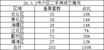 2026年3月2日宁波市六区二手房共成交203套,分别为北仑区成交33套,奉化区成交28套,海曙区成交28套,江北区成交15套,鄞州区成交72套,镇海区成交27套