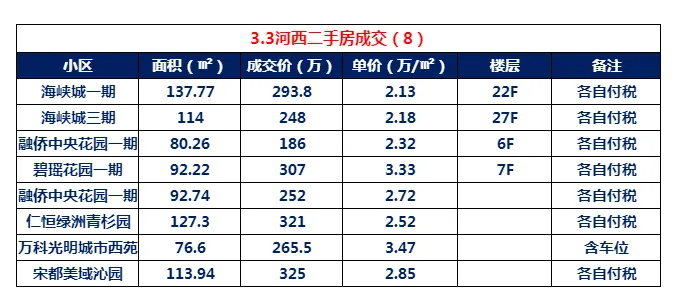 3.3日河西二手房成交,据不完全统计共8套,但是有4套没确定到具体房号,今天发出来试试,如果有知道房号的麻烦私信,如果大家觉得没确定具体楼层房号不要发出来,请留言,下回改正。