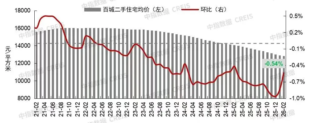 先看近期市场情况,今年前两月,全国百城二手住宅价格指数环比跌幅与去年相比明显收窄。