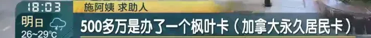 施阿姨:“我问她900万的资金流向,她说200多万是被中介骗了,500多万是办了一个枫叶卡(加拿大永久居民卡)。我就怕那个房产做了抵押,人家要来收我们的房子,拍卖我们的房子,到时候我们两个老人怎么办?去哪里住?我们的权益谁来保障我们?”