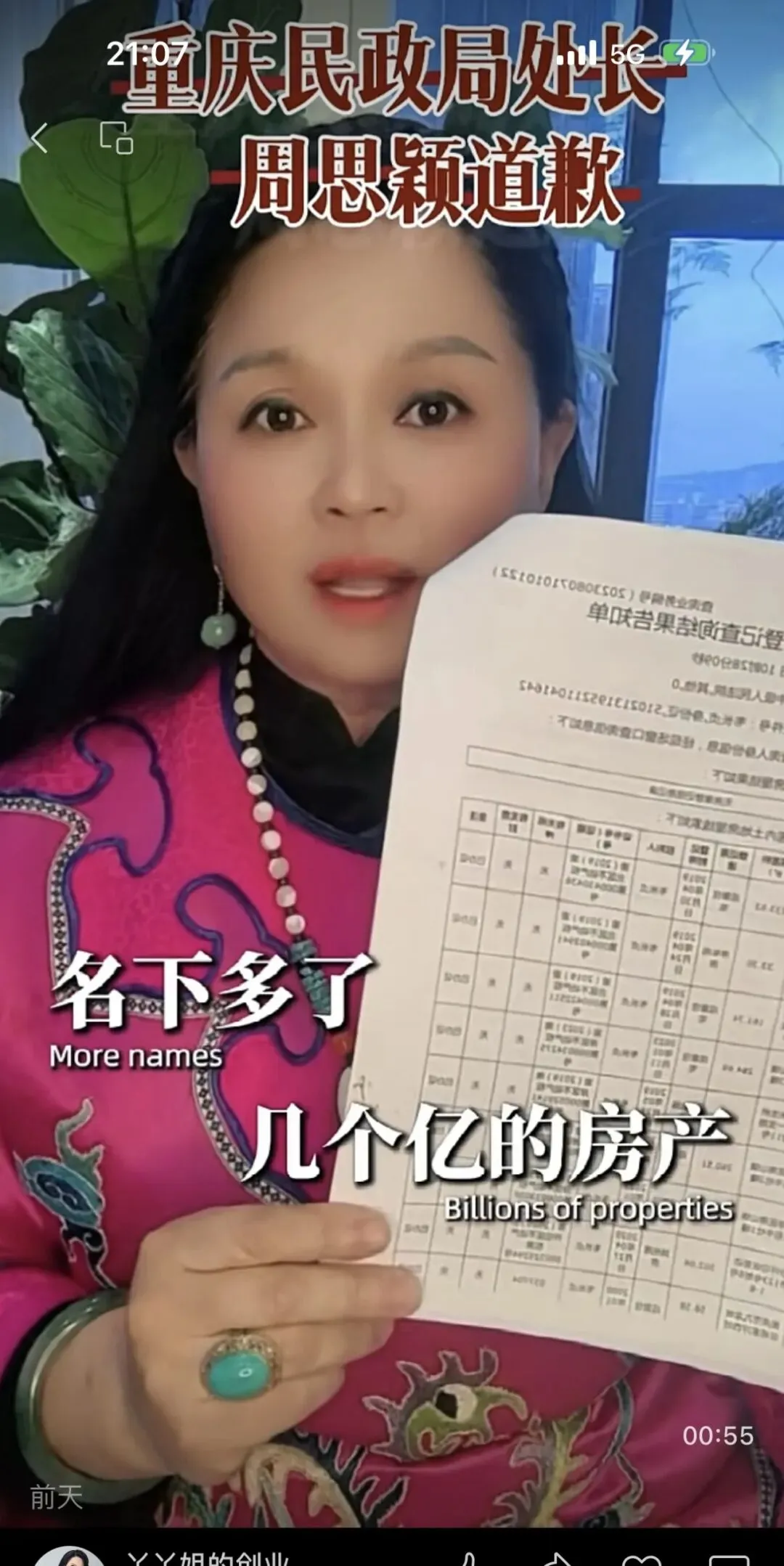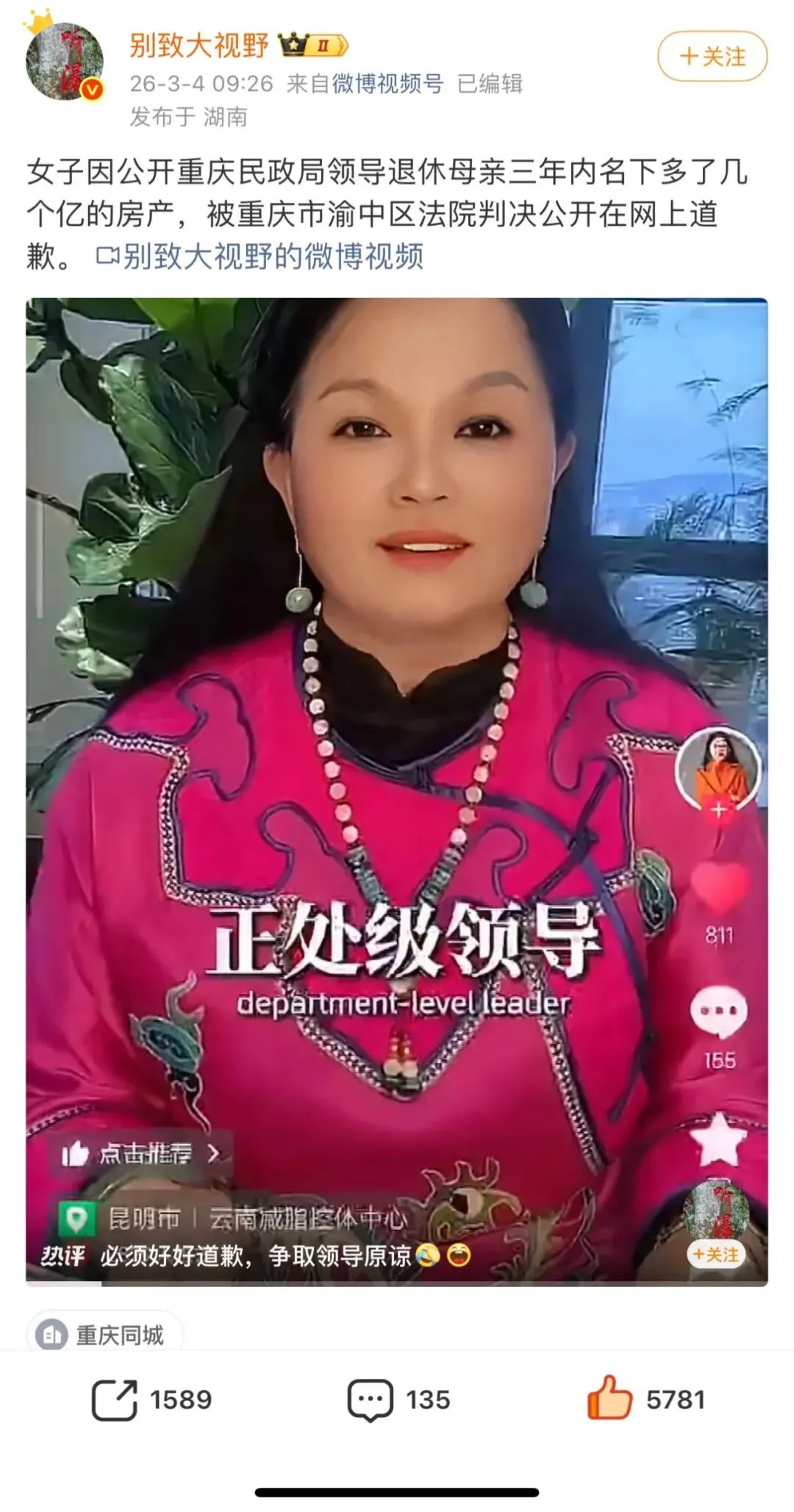 该女子在道歉视频上说:“周某颖处长,对不起,我不应该公开你母亲名下价值700万的宾利车和三年之内名下多了几个亿的房产,你母亲生于1952年,是重庆气体制造厂配电石的金属冶炼工人,今年74岁,已退休多年,我真的是认知不够,我不知道你母亲有那么大的能耐,74岁的一个退休老人,既然能在三年内挣到这几个亿的房产,作为一个25年做生意的我来说,在当今这么困难的经济条件下,没有几个人能有那么大的能力,所以你的母亲让我很佩服,我也冤枉你了,我也错怪你了,对不起,我们应该多向你母亲学习,学习她的经商之道,学习她的挣钱能力。”