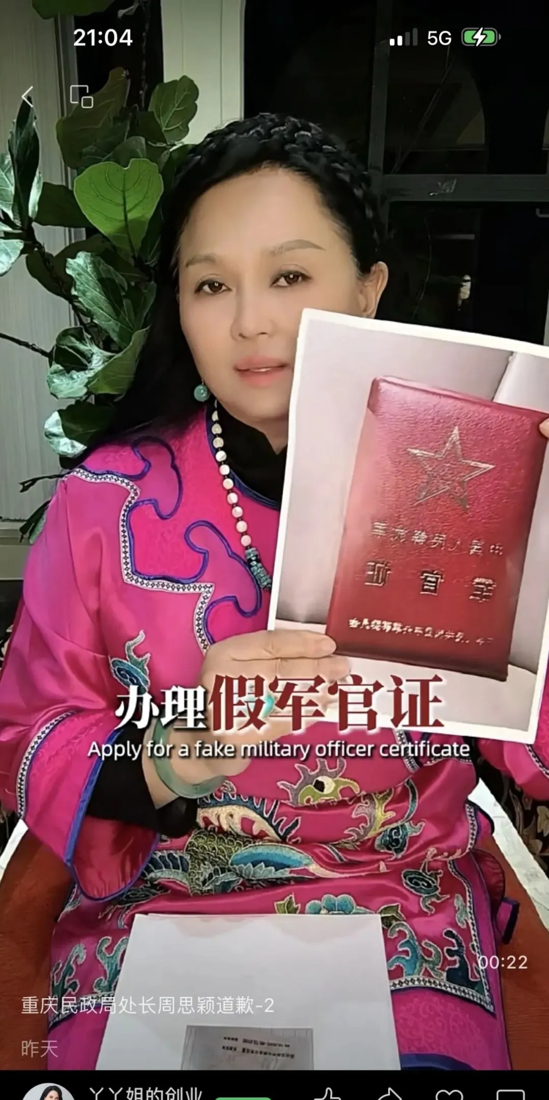另外,在第二条道歉视频中,她特列举了周某颖处长的一系列身份头衔,然后画风一转,说道:“你真的非常优秀,我在此向你道歉,我不应该将你没有当过兵的老公办理假军官证、假身份证这些事情发到网上,对不起,我错了,我向你赔礼道歉,这是属于你职权范围内的事,这是属于你家庭里面的隐私,所以,我不能公开发到网上。”